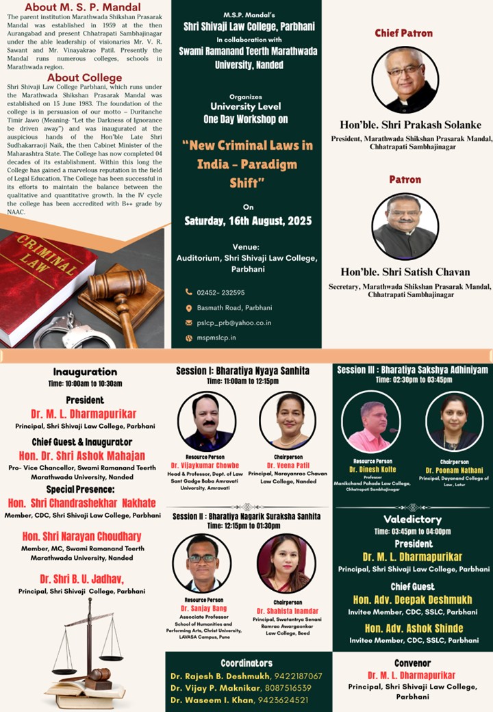 Shri Shivaji Law College Parbhani, a premier Institute imparting legal education was founded by the famous Marathwada Shikshan Prasarak Mandal Aurangabad on 15